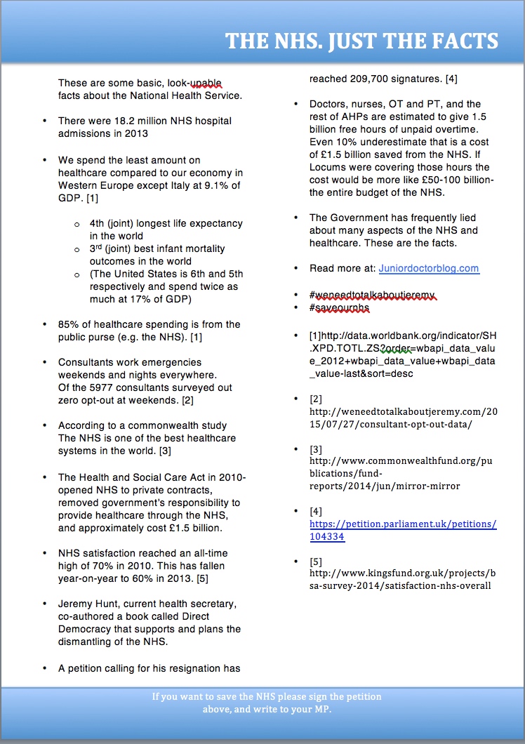 “Crash call for the NHS: The Doctors Will See You Now” is a mass protest on the 22nd August in London, venue and permits pending: a CPR marathon (on mannequins) to symbolise how we as health professionals are fighting to keep the NHS alive, despite the best efforts of a Health Secretary clearly aligned against it. We will be educating the public on basic resuscitation at the same time and hopefully replicating the opportunity for lay people to talk to doctors, nurses and other AHPs about the NHS, with just the facts, as above.